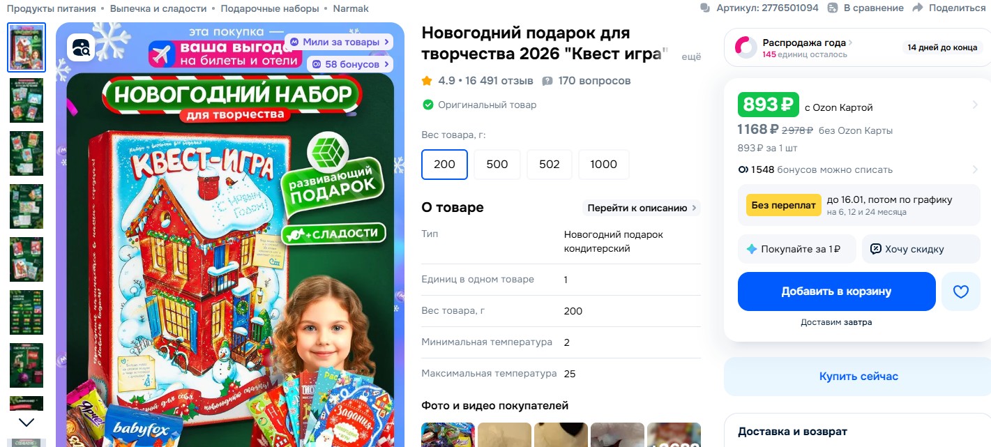 | 44 | 875 00 ₽ | 36 | 31 500 00 ₽ | 09 декабря 2025 | Подарок детям к Новому году 2026 |